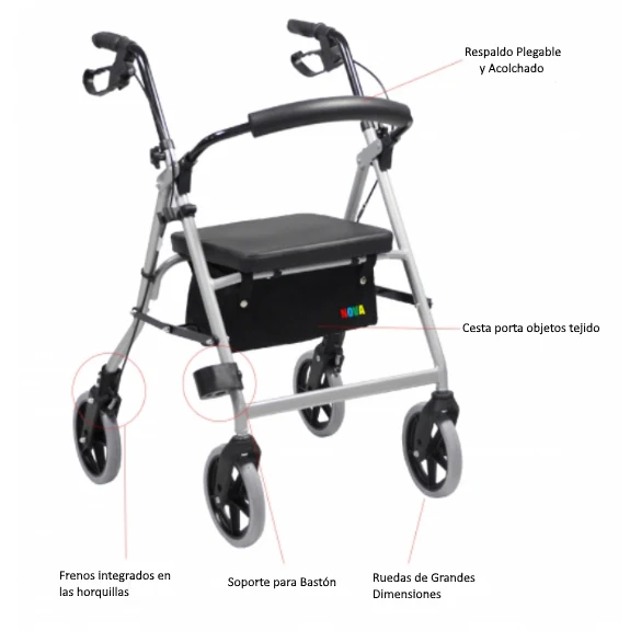 - ASIENTO: Dispone de un asiento acolchado con respaldo para sentarse cómodamente, además de incorporar una cesta de compras de lona ubicada debajo del asiento y soporte para el bastón para facilitar tu Vida a Diario.