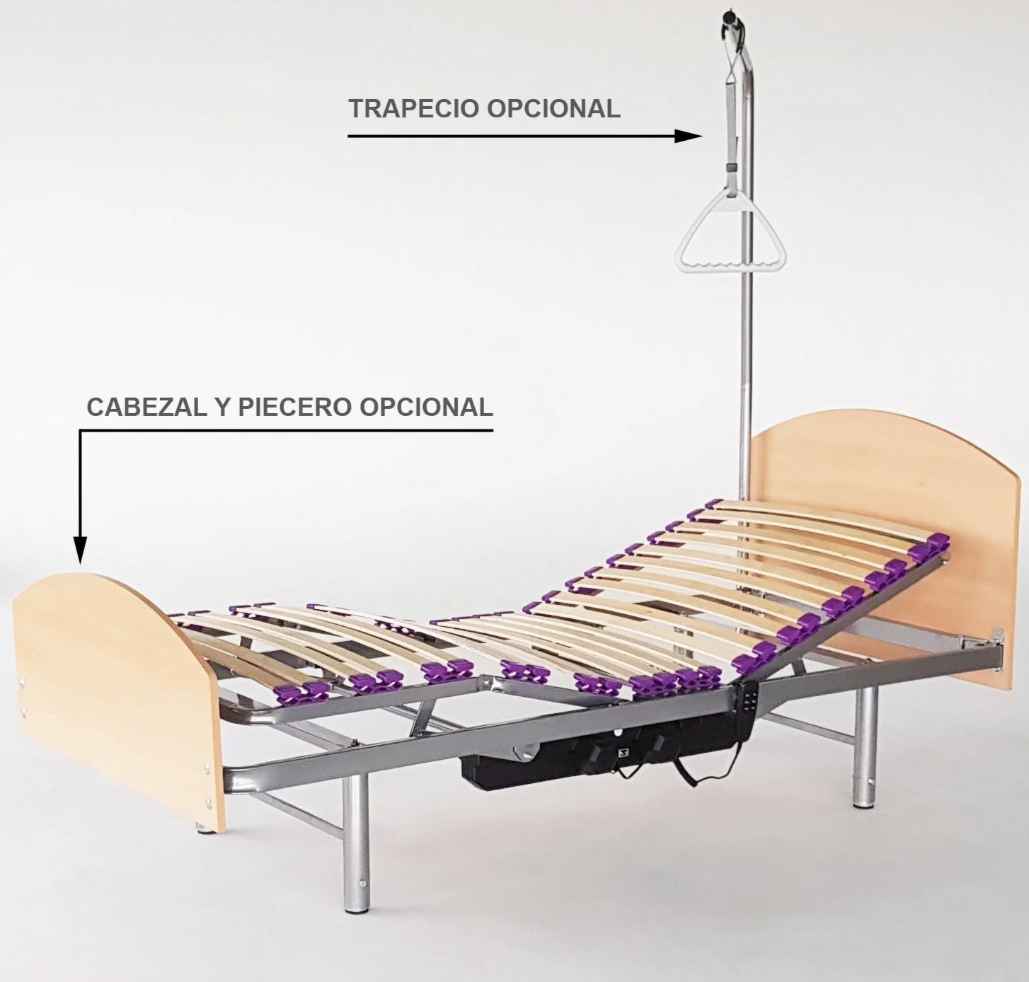 Podemos complementar nuestra cama elevada con accesorios tales como cabezal y piecero, barandillas de metal y trapecio de incorporación.