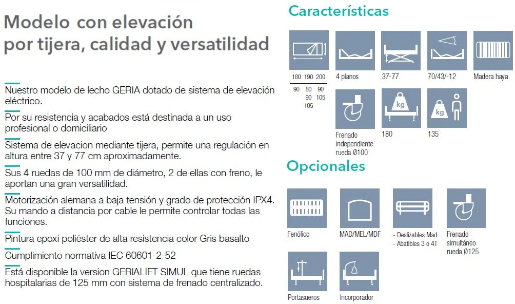 Cama Tijera de cuidados diseñada especialmente para uso hospitalario, en domicilio o residencia, su estructura de lecho superpuesto al marco y fabricación en láminas de Acero con espesor de 1,5 a 3 mm incrementan la superficie para un descanso placentero y su sistema de elevación con mecanismo de mesa tijera (abre y cierra) facilita los cuidados asistidos como la alimentación, el aseo, y el cambio de posición del Usuario, aportando mayor comodidad al usuario y su cuidador.