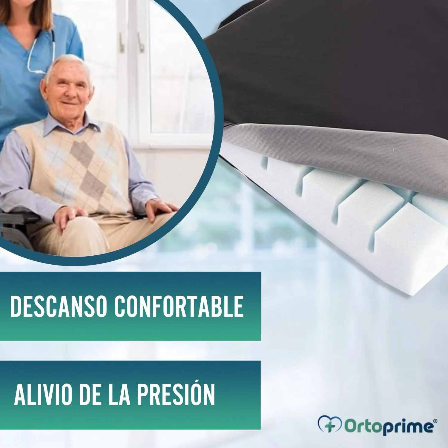 Asiento con espuma de memoria fabricado en tejidos suaves y transpirables idóneo para prevenir o mejorar las escaras o llagas en la piel consecuentes de la presión que ejerce el hueso sobre la dermis en pacientes que ven reducida su movilidad de forma considerable. También está indicado para mujeres durante el postparto o para personas que cuentan con problemas de hemorroides, almorranas o cualquier otra complicación derivada, por ejemplo, de las lumbares o cervicales. Cojín ergonómico con adaptación anatómica al peso y forma de paciente, asegurando la comodidad y protección.
