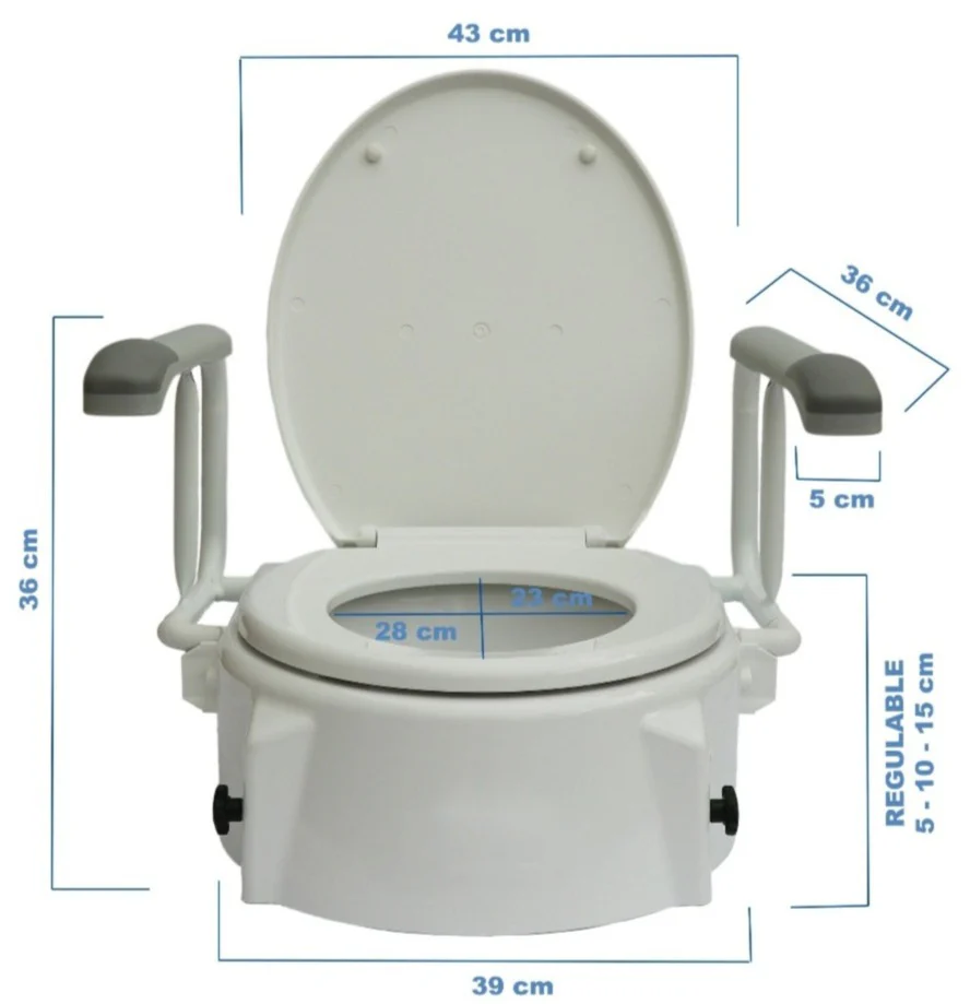 - COMODIDAD: Gracias a sus reposabrazos acolchados abatibles, su capacidad de inclinación y su regulación de altura graduable en 6, 10 y 15 cm el Elevador WC requinable otorga la seguridad y tranquilidad que necesita a la hora de ir al baño,